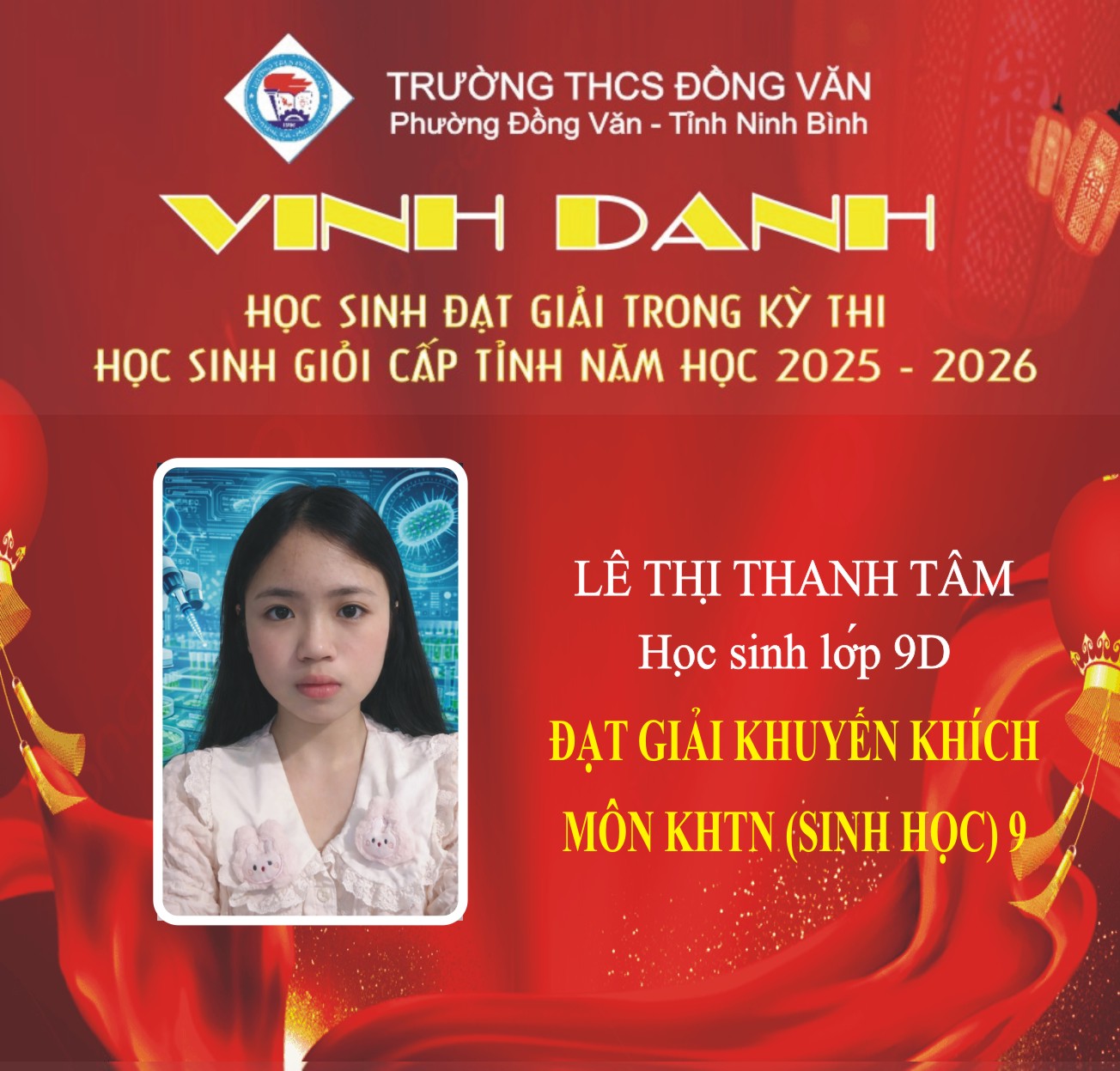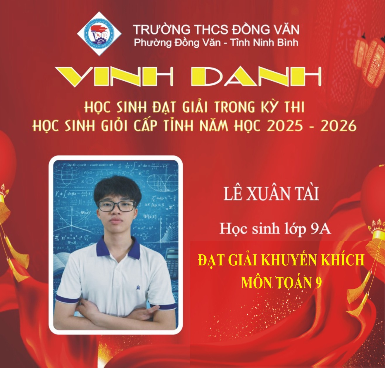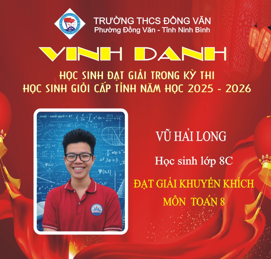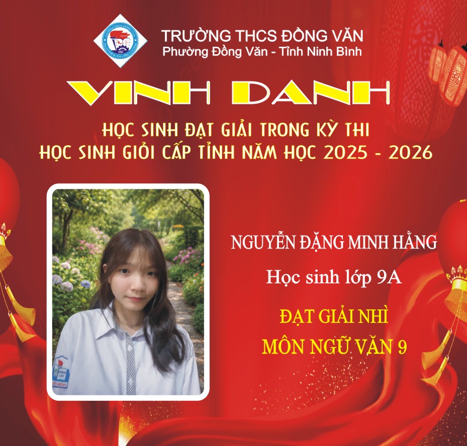 Trong không khí thi đua sôi nổi của năm học, Trường THCS Đồng Văn vui mừng và tự hào vinh danh các em học sinh đã xuất sắc đạt giải trong kỳ thi Học sinh giỏi cấp Tỉnh. Đây là những thành tích đáng trân trọng, khẳng định chất lượng giáo dục của nhà trường, đồng thời ghi nhận sự nỗ lực không ngừng của các em học sinh, sự tận tâm của đội ngũ giáo viên và sự đồng hành quý báu của các bậc phụ huynh.