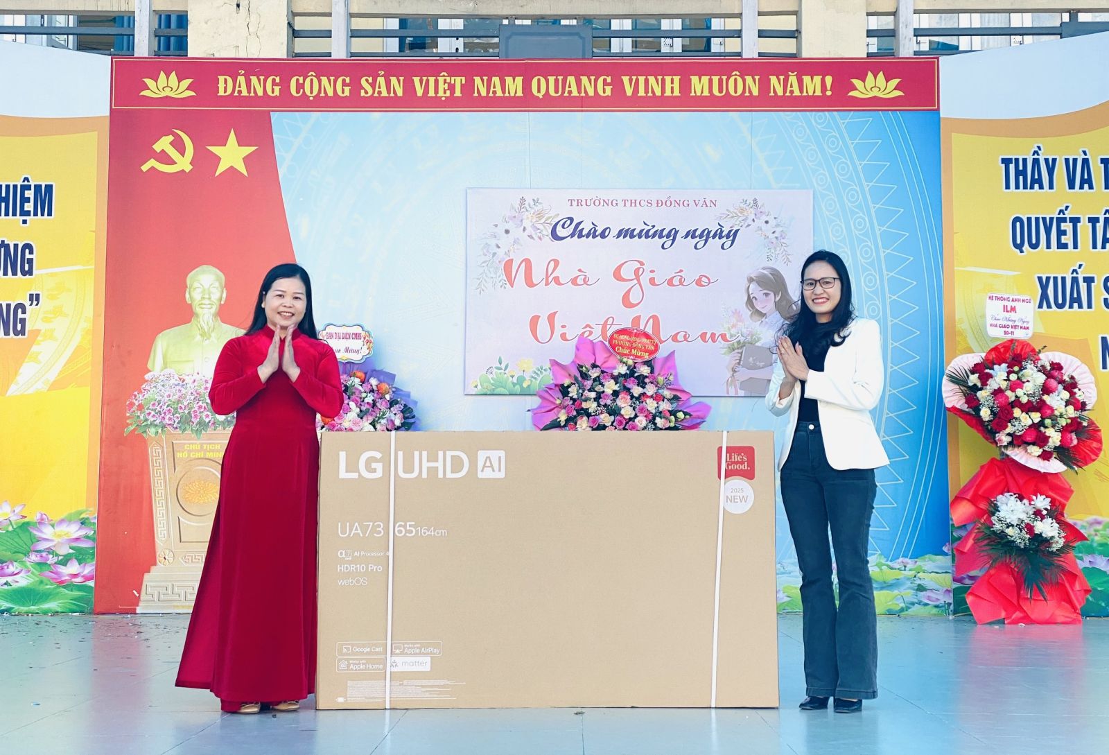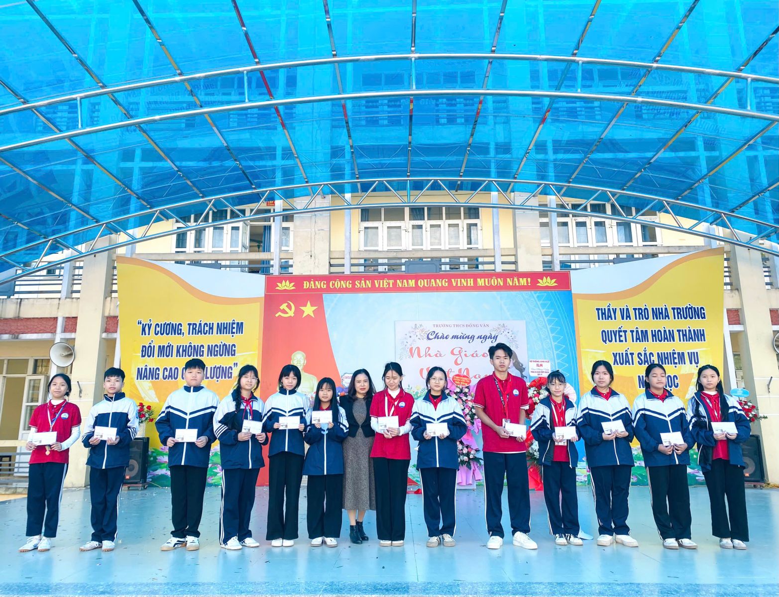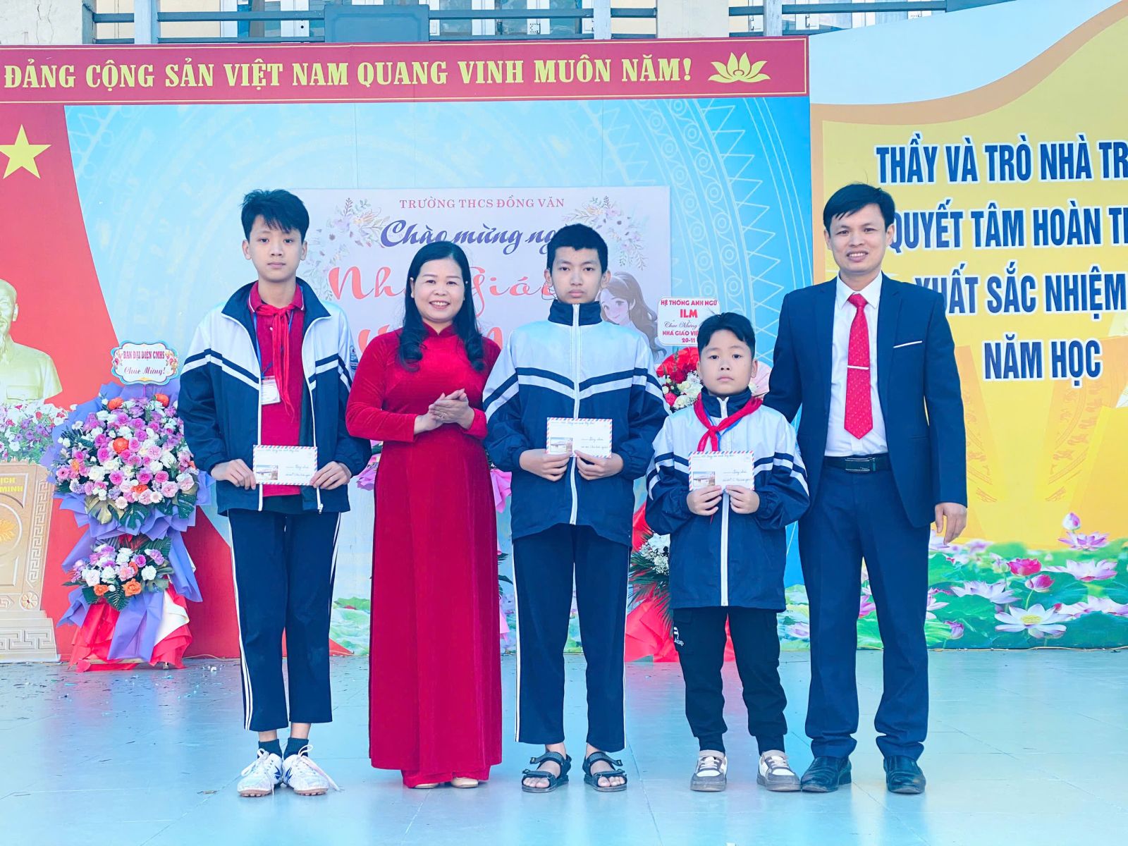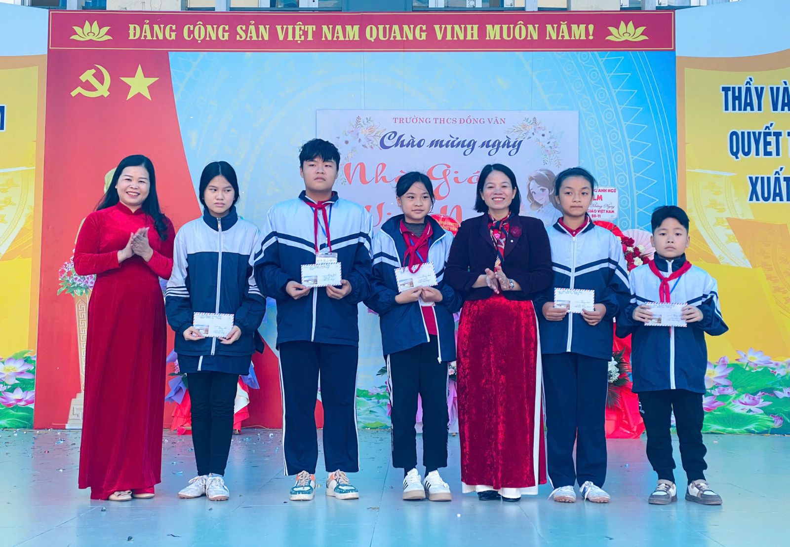 Trong hội nghị các thầy, cô giáo nhà trường cũng nhận được những tình cảm, lời chúc mừng cùng những bó hoa tươi thắm và những phần quà, học bổng dành tặng cho các em học sinh có hoàn cảnh khó khăn từ các cấp lãnh đạo địa phương, ban đại điện cha mẹ học sinh và các doanh nghiệp trên địa bàn.